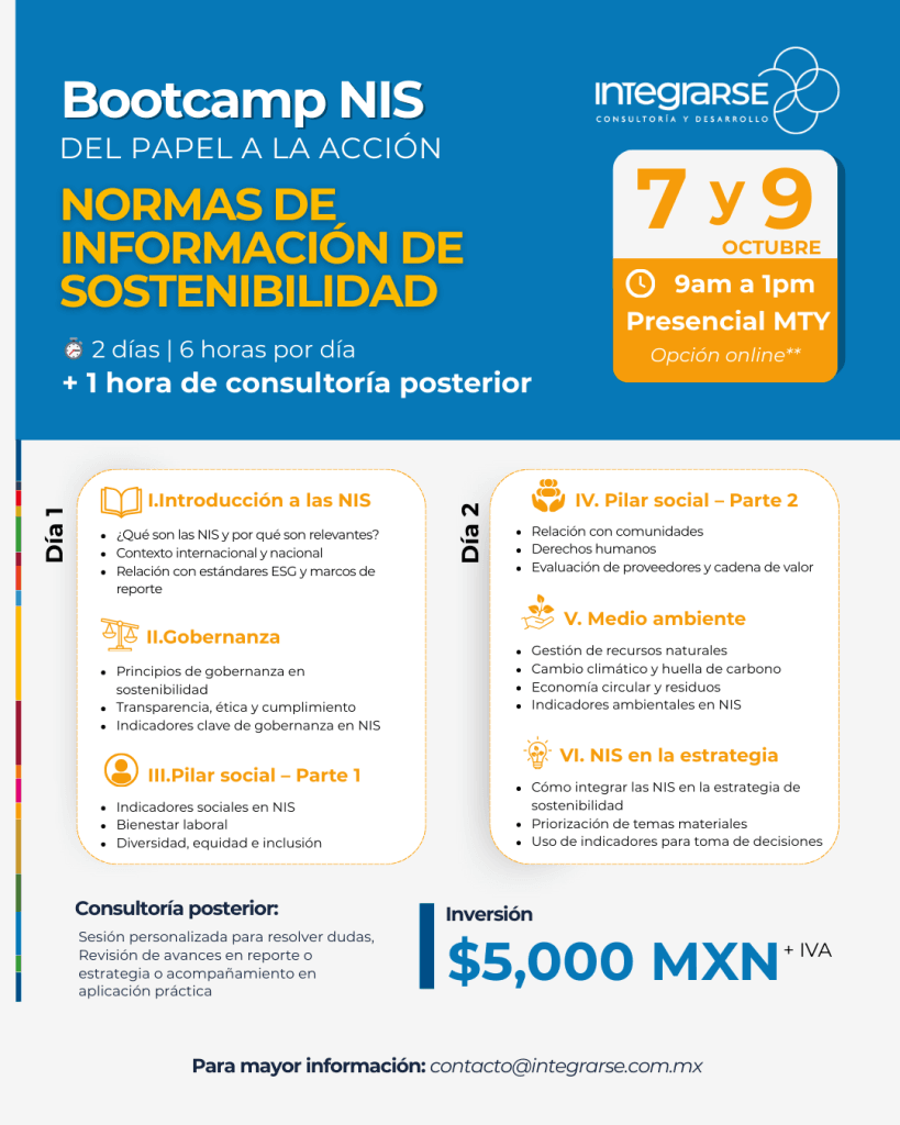 Las Normas de Información de Sostenibilidad (NIS) están transformando la manera en que las empresas reportan y gestionan su impacto. Este Bootcamp te dará herramientas prácticas para llevarlas de la norma a la acción en la operación real de tu organización.